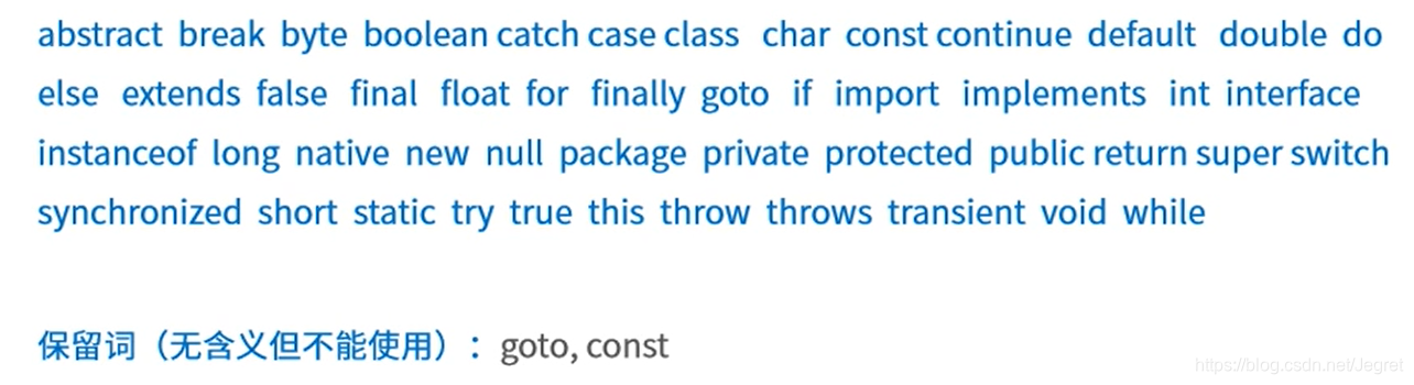关键字是Java里事先定义好并赋予特殊含义的单词,也被称为保留字,标识符不能和关键字冲突。